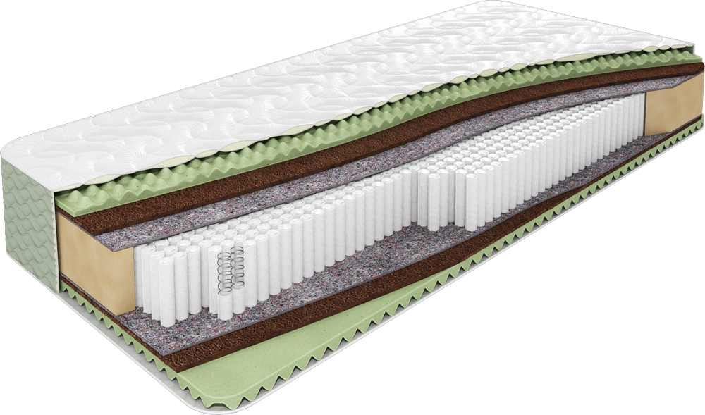 Матрас изготовлен из массажной пены ErgoFoam с обеих сторон, что обеспечивает комфорт и расслабляющий массажный эффект во время сна. Дополнительно, кокосовый слой толщиной 1 см с обеих сторон придаёт матрасу необходимую жесткость и поддерживает правильное положение позвоночника. Внутри матраса расположен пружинный блок S 2000 с независимыми пружинами, который даёт индивидуальную поддержку для каждого участка тела. Число 2000 обозначает количество, что на каждый квадратный метр приходится около 1000 пружин, которые обеспечивают надёжную ортопедическую поддержку спины и удобство отдыха в любом положении и выдерживают вес до 160 кг и подходят людям с весом больше среднего. Чехол матраса выполнен из объемного простеганного трикотажа (ортопена), который придаёт приятные тактильные ощущения и хорошую воздухопроницаемость. Боковина из простеганной ткани букле добавляет элегантности и стиля.