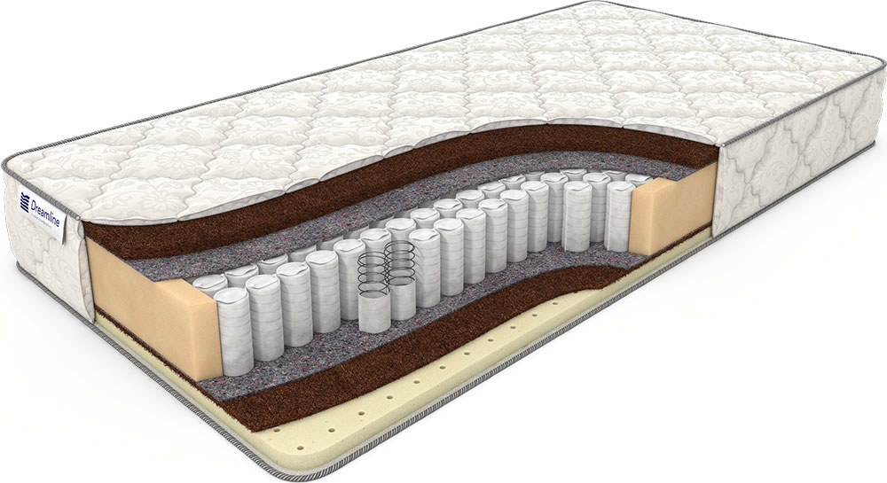 Поверхности с различными свойствами смонтированы на продвинутой модели независимого пружинного блока TFK, гасящего нежелательные колебания. Первая сторона – максимальная жёсткость за счёт утолщённого слоя наполнителя из кокосовой койры. Вторая сторона – сбалансированная анатомичность за счёт двух слоёв наполнителя: внутреннего слоя из кокосовой койры и внешнего из натурального латекса. Прослойка из натурального льноджутового волокна изолирует металлическую конструкцию от нежелательных контактов с натуральными наполнителями, продлевая срок службы матраса.