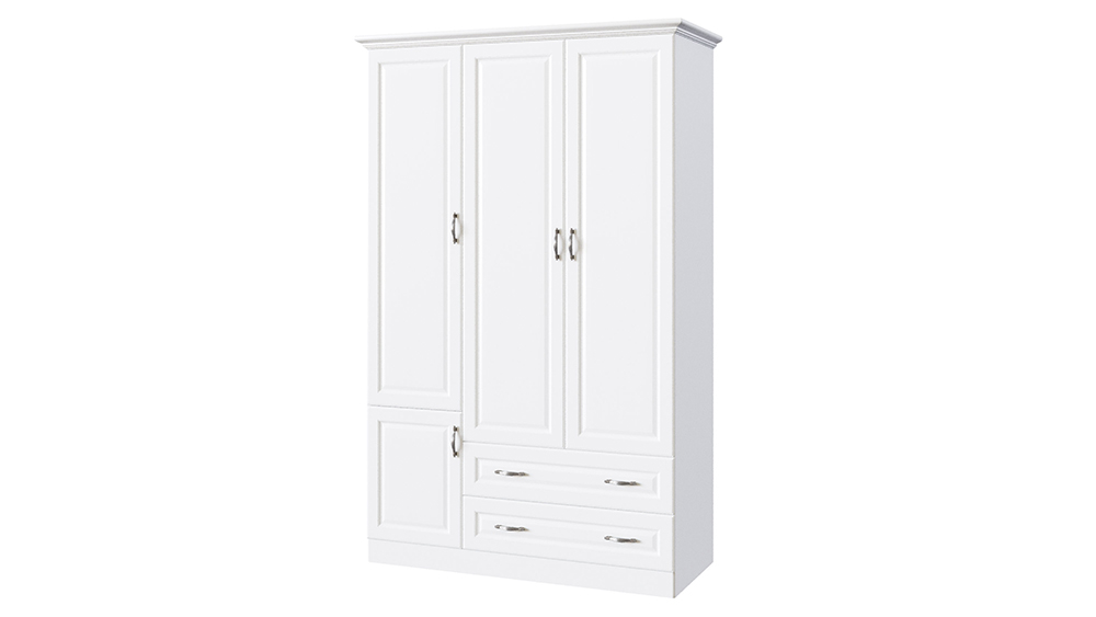 Классический шкаф, созданный в едином стиле с коллекцией Эдем — изделие без которого не возможно себе представить спальню. Корпус шкафа может быть изготовлен как из массива бука и ясеня, так и из массива мягколиственных пород, что делает его стоимость еще более демократичной. Трех створчатый шкаф имеет 3 базовые комплектации: c антресольной секцией в верхней (3-3) или нижней части (3-1) шкафа, или двумя выкатными ящиками (3-2) в нижней части шкафа. Стандартно двух створчатая секция шкафа располагается в правой части шкафа. Фасады шкафа могут иметь встроенные зеркала, как на лицевой части фасада — по размеру филенчатой части, так и на внутренней стороне фасада. Распашные дверцы шкафа оснащены петлями с системой до-закрытия в базовой комплектации. В большей секции шкафа предусмотрена штанга для плечиков, а в малой секции предусмотрены 3 полки для хранения вещей. По желанию шкаф может быть оснащен любым количеством полок.