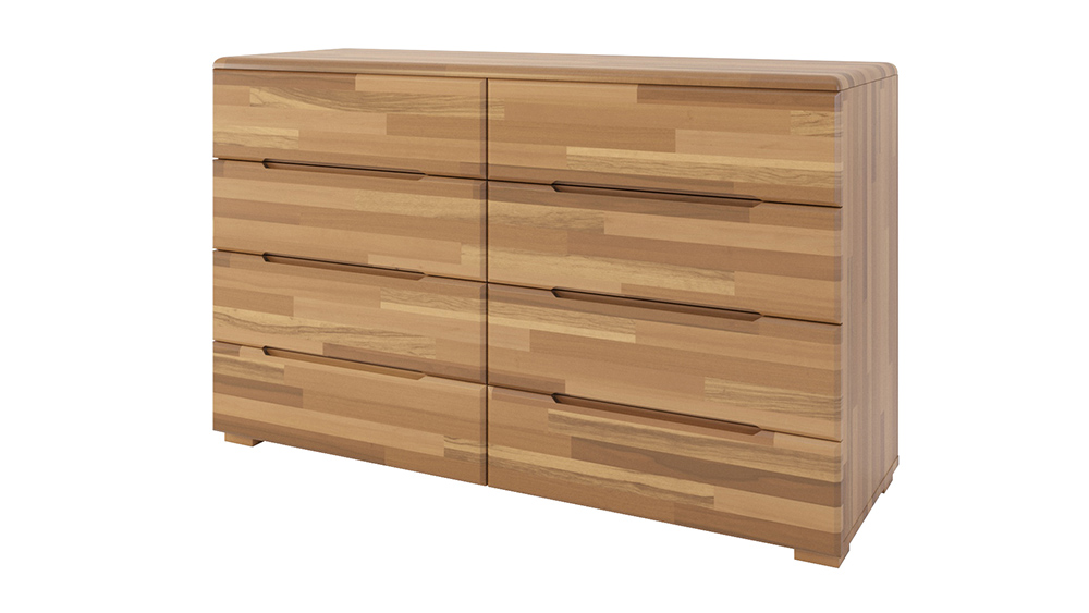 Комод широкий Мальмо создан для людей, которые ценят простоту в деталях современного интерьера. Комод выполнен полностью из массива бука. По прочности бук схож с дубом, устойчив к механическим воздействиям, а также, обладает тонким ароматом натуральных смол, которые создадут неповторимый уют и тепло к комнате. Изделие имеет приятный тёплый оттенок, в каждом брусочке можно рассмотреть уникальный неповторимый рисунок дерева. Такой цвет позволит легко сочетать мебель данной коллекции с другими элементами вашей спальни. Ящики открываются и закрываются бесшумно и плавно благодаря использованию в производстве только самых качественных и долговечных механизмов. Ручки ящиков удобно вырезаны в фасаде, что добавляет комоду стильного минимализма и комфорта в процессе использования. А за счет скруглённых углов комод имеет обтекаемую, мягкую форму. Такое строение комода безопасно для использования и в детских комнатах. Опционально комод может быть оснащен автоматическими доводчиками выкатных ящиков, а также изменен по высоте за счет добавления или убавления ящика стандартного размера. Требуется сборка.