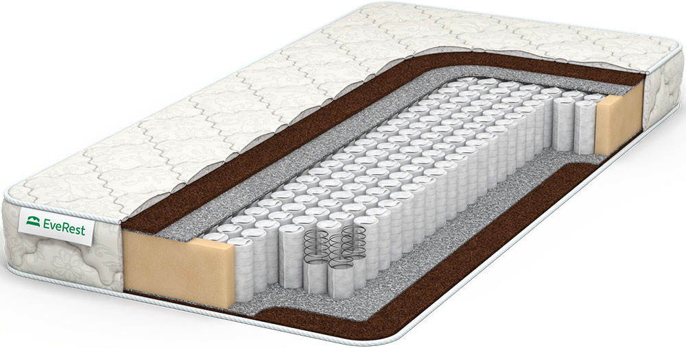 Жесткий пружинный матрас с ортопедическим эффектом и одним видом наполнителя — койрой кокоса. Популярный блок TFK, обеспечивает ортопедические свойства матраса. В его основе лежат самые прочные пружины с сечением стальной проволоки 2 мм. Плотность размещения пружин — 250 пр./кв.м. Кокосовые плиты 1 см толщиной с обеих сторон придают матрасу жесткость. Это натуральный наполнитель, пропитанный латексом для повышения пластичности настила и скрепления волокон кокоса. Между наполнителем и пружинным блоком проложен войлок, защищающий койру от истирания. Покрытие матраса из хлопкового жаккарда.