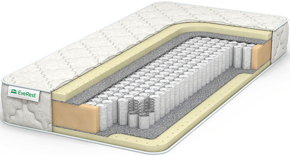 В основе лежит блок из небольших пружин TFK (250 пр./кв.м) с толщиной проволоки 1,8 мм. Выдерживают значительные нагрузки. За счет большого количества пружин матрас точно повторяет изгибы тела.